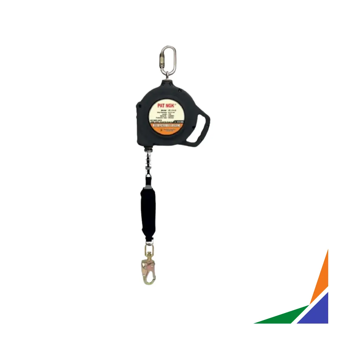 Línea retráctil PAT NGK con CABLE DE ACERO GALVANIZADO, de diseño para usarse como parte de un sistema de protección personal contra caídas, y reduce la fuerza de impacto vertical en el cuerpo limitando la distancia de caída.